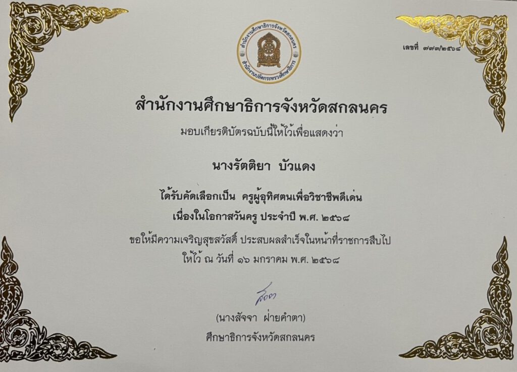 คณะคครูโรงเรียนอนุบาลโคศรีสุพรรณกได้รับคัดเลือกเป็น ครูผู้อุทิศตนเพื่อวิชาชีพดีเด่น เนื่องในโอกาสวันครูครั้งที่ 69 ประจำปี 2568 จากศึกษาธิการจังหวัดสกลนคร