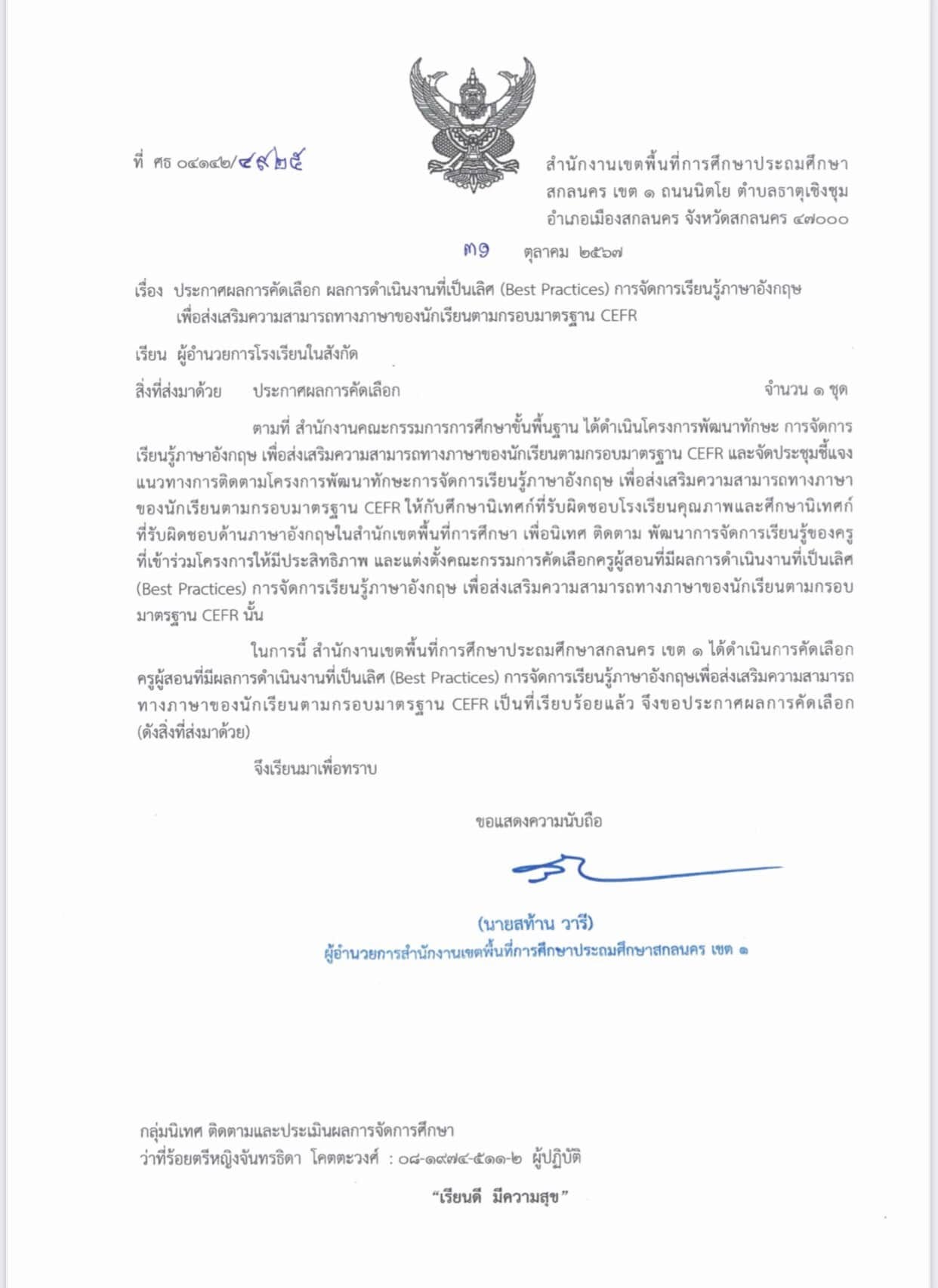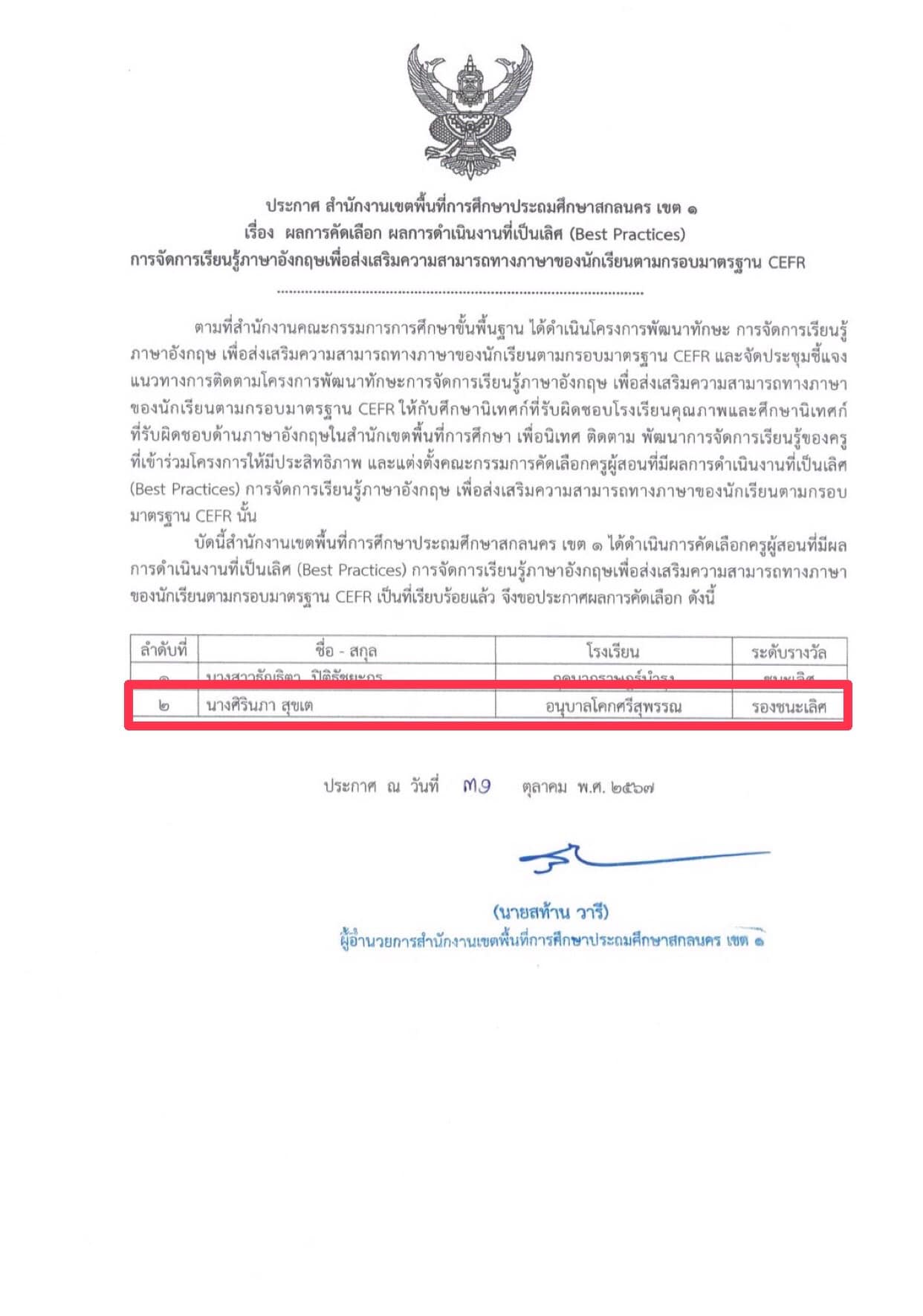 โรงเรียนอนุบาลโคกศรีสุพรรณขอแสดงความยินดีกับ นางศิรินภา สุขเต ครูผู้สอนที่มีผลการดำเนินงานที่เป็นเลิศ (Best Practices) การจัดการเรียนรู้ภาษาอังกฤษ เพื่อส่งเสริมความสามารถทางภาษาของนักเรียนตามกรอบมาตรฐาน CEFR