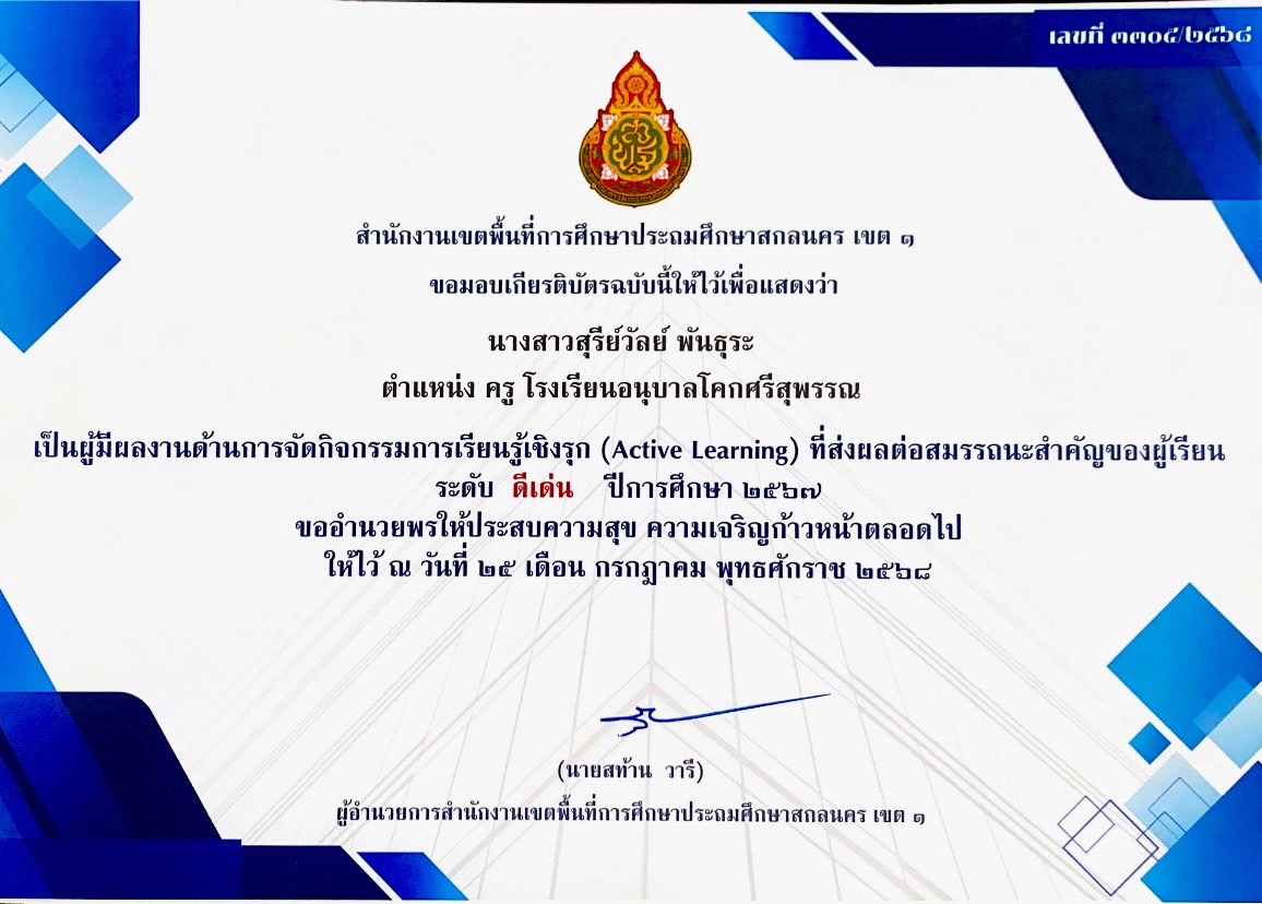 ขอแสดงความยินดีกับ นางสาวสุรีวัลย์ พันธุระ ครูโรงเรียนอนุบาลโคกศรีสุพรรณ เป็นผู้มีผลงานด้านการจัดกิจกรรมการจัดการเรียนรู้เชิงรุก (Active Learning) ที่ส่งผลต่อสมรรถนะสำคัญของผู้เรียน ระดับ ดีเด่น ปีการศึกษา ๒๕๖๗ จากสำนักงานเขตพื้นที่การศึกษาประถมศึกษาสกลนคร เขต ๑