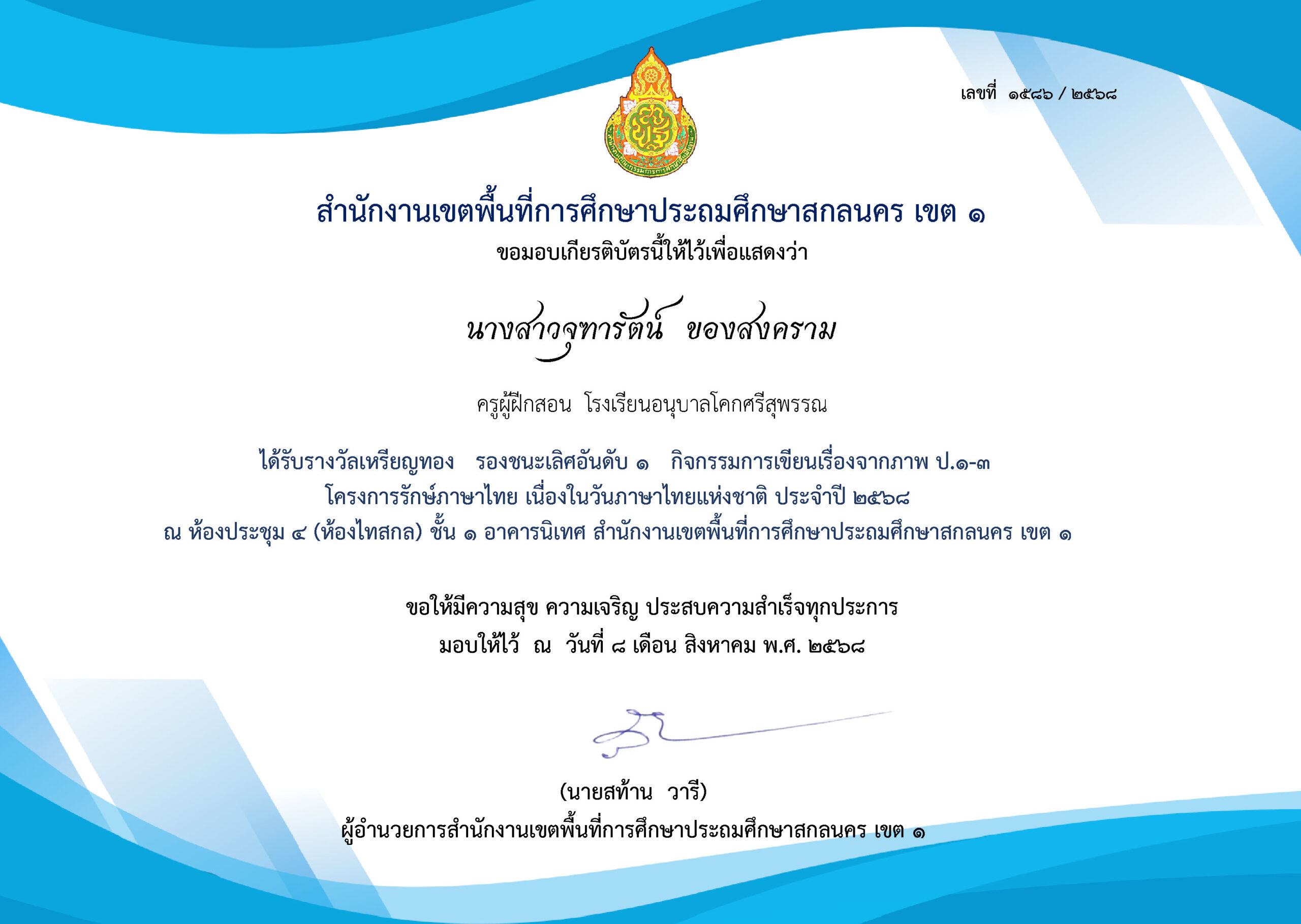 ผลงานรางวัลเด่น โรงเรียนอนุบาลโคกศรีสุพรรณ ของแสดงความยินดีกับนักเรียนและครูผู้ฝึกซ้อมที่ได้เหรียญทอง รองชนะเลิศอันดับ ๑ กิจกรรมการเขียนเรื่องจากภาพ โครงการรักษ์ภาษาไทย เนื่องในวันภาษาได้แห่งชาติ ประจำปี 2568 ระดับสำนักงานเขตพื้นที่การศึกษาประถมศึกษา สกลนคร เขต 1 8 สิงหาคม 2025 admin โรงเรียนอนุบาลโคกศรีสุพรรณ ของแสดงความยินดีกับนักเรียนและครูผู้ฝึกซ้อมที่ได้เหรียญทอง รองชนะเลิศอันดับ ๑ กิจกรรมการเขียนเรื่องจากภาพ โครงการรักษ์ภาษาไทย เนื่องในวันภาษาได้แห่งชาติ ประจำปี 2568 ระดับสำนักงานเขตพื้นที่การศึกษาประถมศึกษา สกลนคร เขต 1 วันที่ 8 สิงหาคม 2568