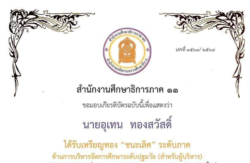 นายอุเทน ทองสวัสดิ์ ผู้อำนวยการโรงเรียนอนุบาลโคกศรีสุพรรณ รับเกียรบัตร ผลงานการปฏิบัติที่เป็นเลิศระดับศึกษาธิการภาค 11 มหกรรมวิชาการแลกเปลี่ยนเรียนรู้ “Education Reform รวมพลังคน “สนุก” พลิกโฉมการศึกษาสู่อนาคตอย่างยั่ง