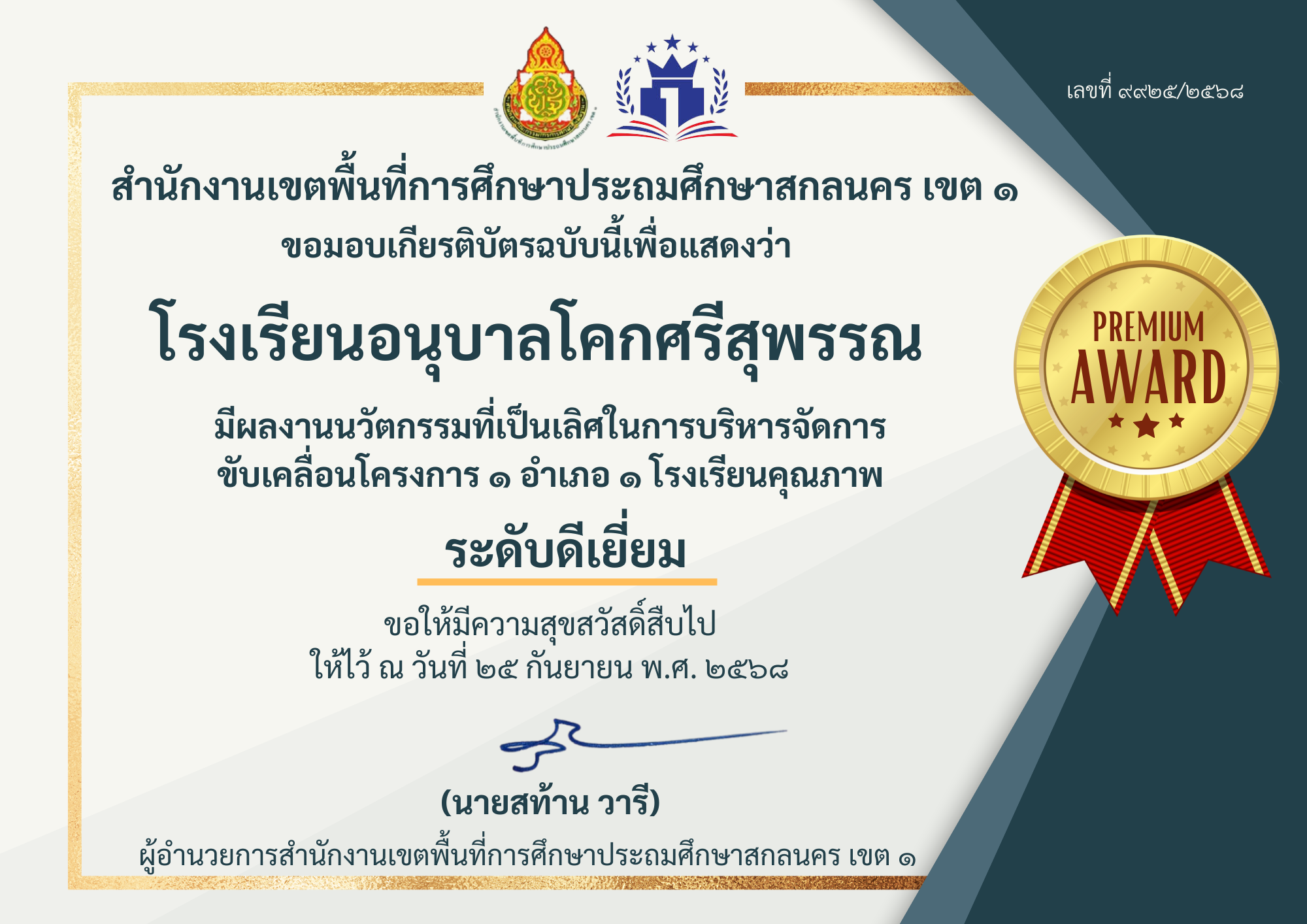 โรงเรียนอนุบาลโคกศรีสุพรรณ ได้รับการคัดเลือกผลงานนวัตกรรมที่เป็นเลิศในการบริหารจัดการขับเคลื่อนโครงการโรงเรียนคุณภาพ 5 ด้าน และผลงานที่เป็นเลิศของครูด้านการจัดการเรียนการสอนโดยใช้เทคโนโลยี Ai