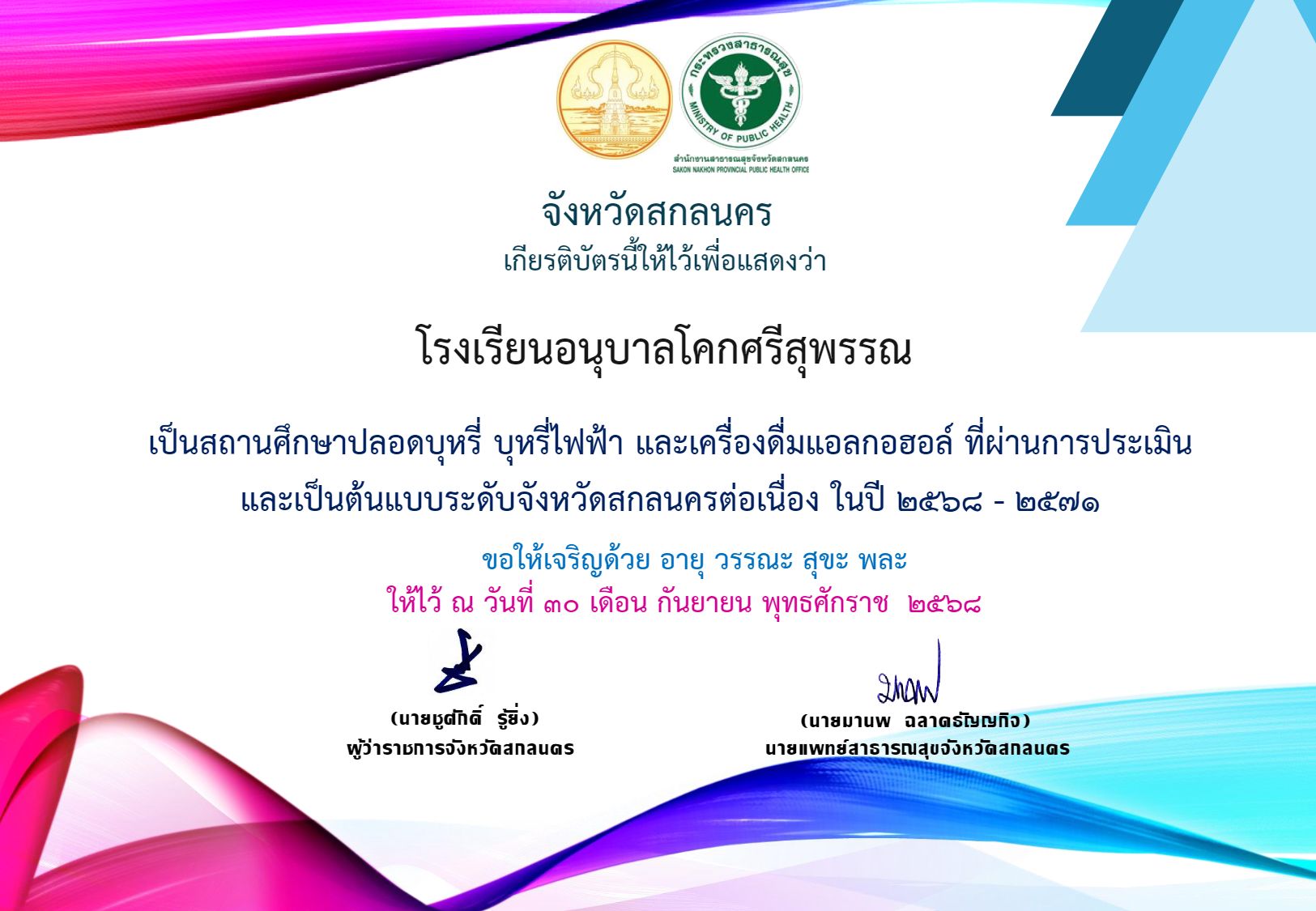โรงเรียนอนุบาลโคกศรีสุพรรณ เป็นสถานศึกษาปลอดบุหรี่ บุหรี่ไฟฟ้า และเครื่องดื่มแอลกอฮอล์ ที่ผ่านการประเมินและเป็นต้นแบบะดับจังหวัดสกลนครต่อเนื่อง ในปี 2568 – 2571