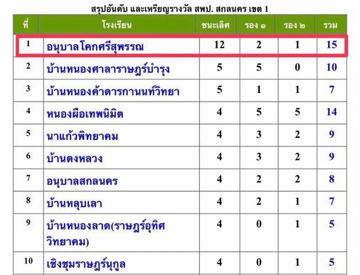 โรงเรียนอนุบาลโคกศรีสุพรรณ ได้รับรางวัลชนะเลิศอันดับ 1 จำนวน 12 รายการ รองชนะเลิศอันดับ 1 จำนวน 2 รายการ รองชนะเลิศอันดับ 2 จำนวน 1 รายการ รวม 15 รายการ ได้รับเหรียญราวัลอันดับ 1 ของเขตพื้นที่การศึกษาประถมศึกษาสกลนคร เขต 1