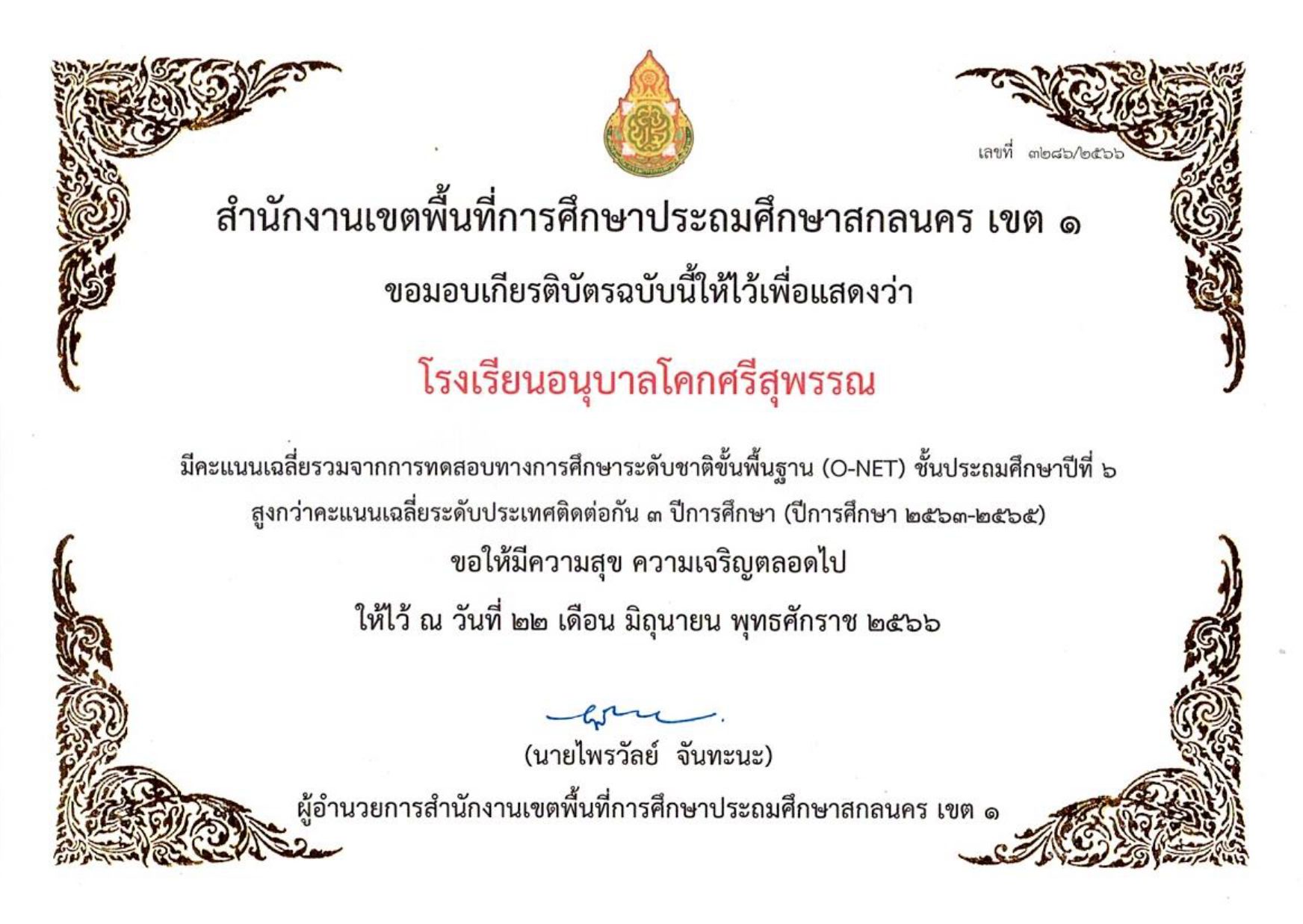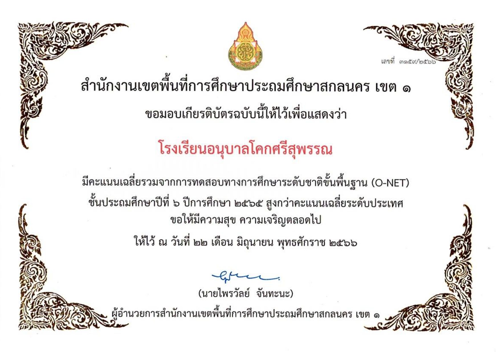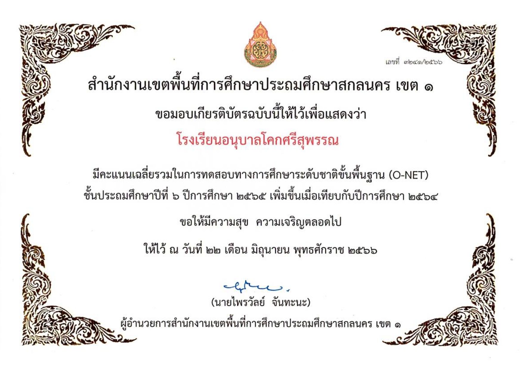 โรงเรียนอนุบาลโคกศรีสุพรรณ ได้รับเกียรติบัตรจากสำนักงานเขตพื้นที่การศึกษาประถมศึกษาสกลนคร เขต 1 จำนวน 3 ฉบับ เพื่อแสดงว่า โรงเรียนอนุบาลโคกศรีสุพรรณ มีคะแนนเฉลี่ยรวมจากการทดสอบทางการศึกษาระดับชาติขั้นพื้นฐาน (O-NET) ชั้นประถมศึกษาปีที่ 6 ปีการศึกษา 2565 สูงกว่าคะแนนเฉลี่ยระดับประเทศ มีคะแนนเฉลี่ยรวมในการทดสอบทางการศึกษาระดับชาติขั้นพื้นฐาน (O-NET) ชั้นประถมศึกษาปีที่ 6 ปีการศึกษา 2565 เพิ่มขึ้นเมื่อเทียบกับปี 2564 และมีคะแนนเฉลี่ยรวมในการทดสอบทางการศึกษาระดับชาติขั้นพื้นฐาน (O-NET) ชั้นประถมศึกษาปีที่ 6 สูงกว่าคะแนนเฉลี่ยระดับประเทศติดต่อกัน 3 ปีการศึกษา (ปีการศึกษา 2563-2565) ให้ไว้ ณ วันที่ 22 มิถุนายน 2566
