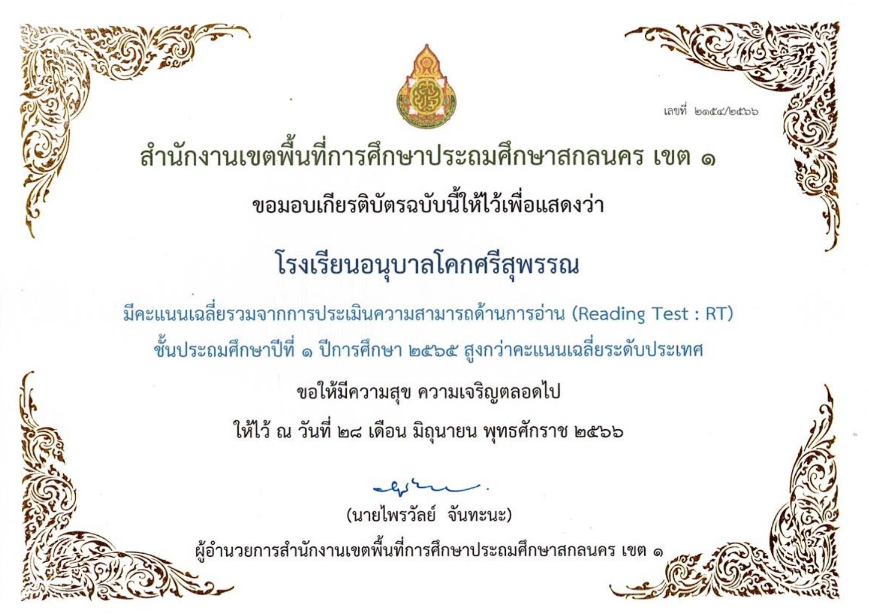 โรงเรียนอนุบาลโคกศรีสุพรรณ ได้รับเกียรติบัตรจากสำนักงานเขตพื้นที่การศึกษาประถมศึกษาสกลนคร เขต 1 เพื่อแสดงว่า โรงเรียนอนุบาลโคกศรีสุพรรณ มีคะแนนเฉลี่ยรวมจากการประเมินความสามารถด้านการอ่าน (Reading Test : RT) ชั้นประถมศึกษาปีที่ 1 ปีการศึกษา 2565 สูงกว่าคะแนนเฉลี่ยระดับประเทศ