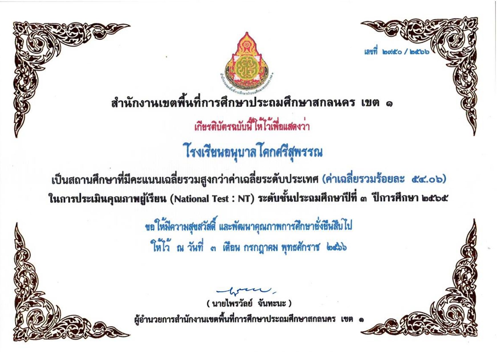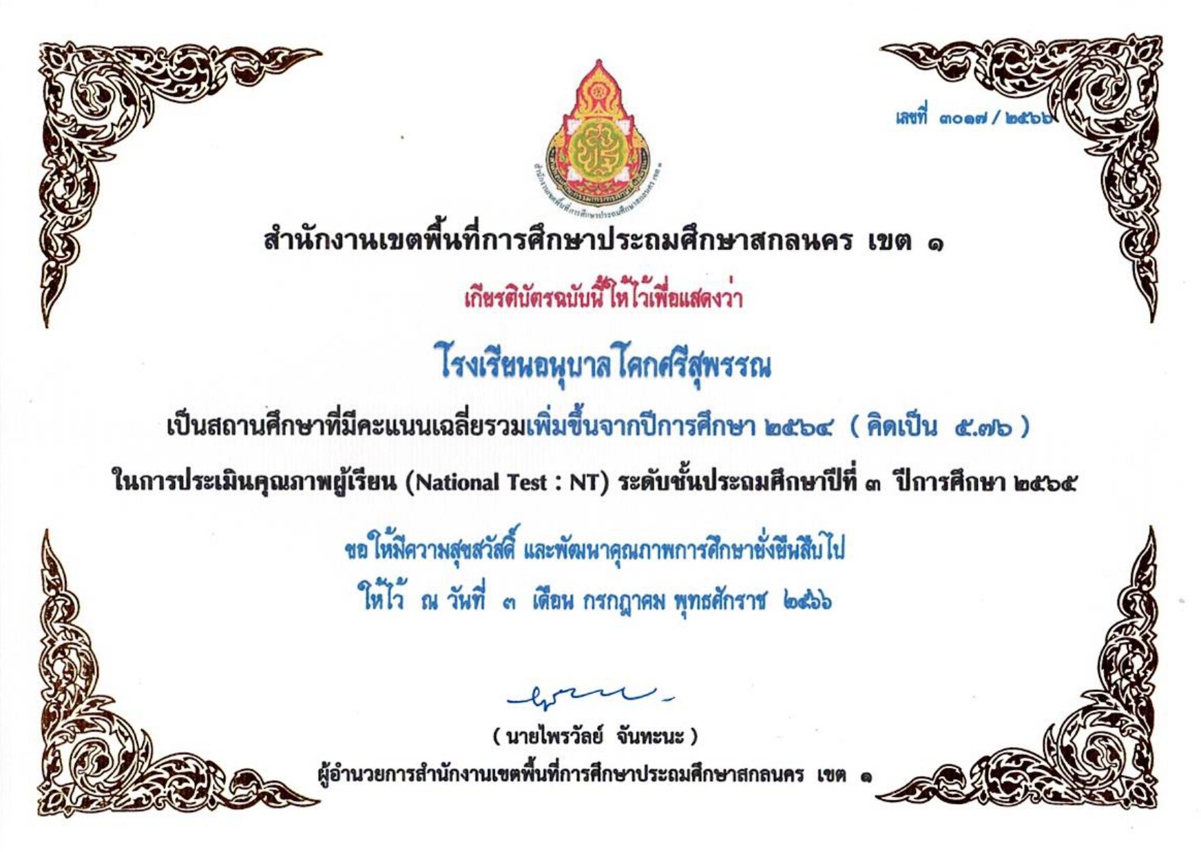 โรงเรียนอนุบาลโคกศรีสุพรรณ ได้รับเกียรติบัตรจากสำนักงานเขตพื้นที่การศึกษาประถมศึกษาสกลนคร เขต 1 ในการประเมินคุณภาพผู้เรียน (National Test : NT)