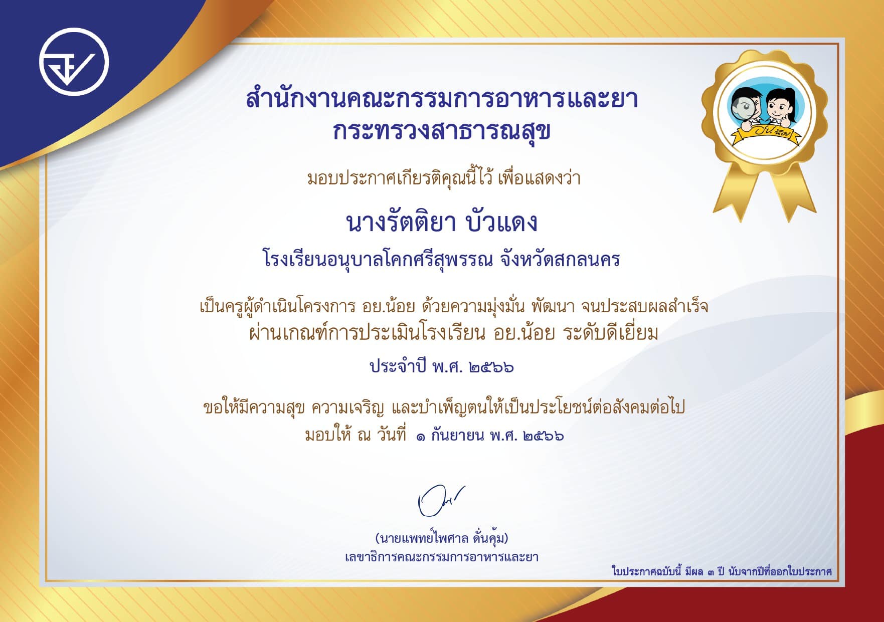 โรงเรียนอนุบาลโคกศรีสุพรรณ ได้รับการประเมินผ่านเกณฑ์ อย.น้อย ระดับดีเยี่ยม ประจำปี 2566