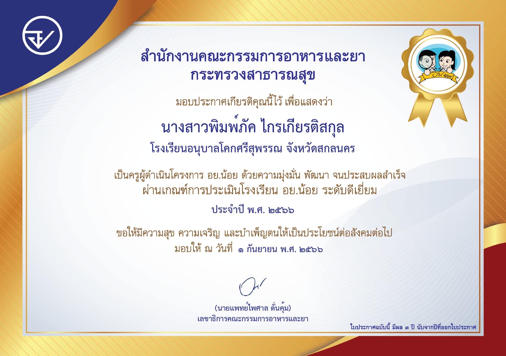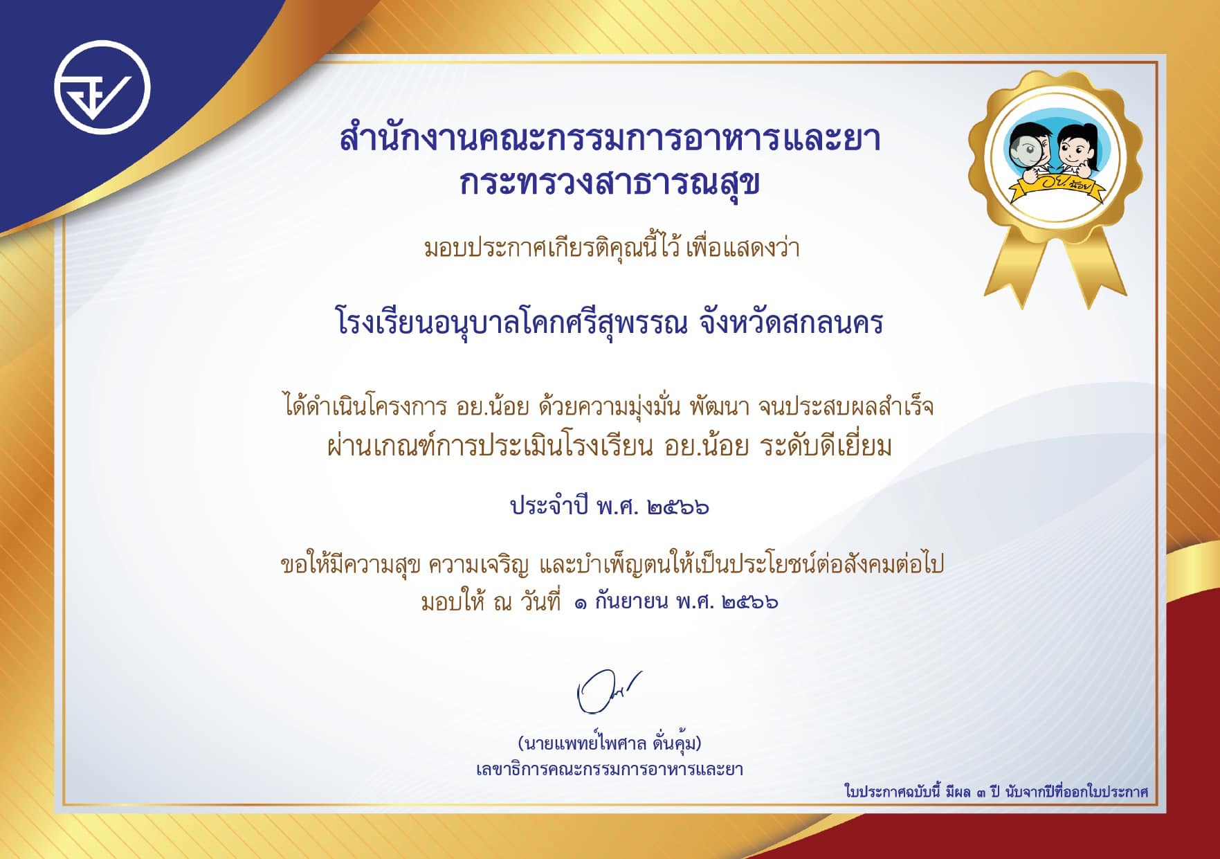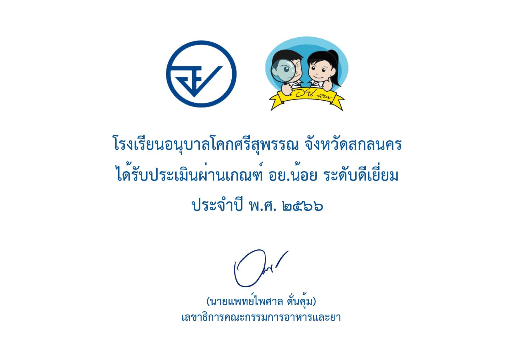 โรงเรียนอนุบาลโคกศรีสุพรรณ ได้รับการประเมินผ่านเกณฑ์ อย.น้อย ระดับดีเยี่ยม ประจำปี 2566 จากสำนักงานคณะกรรมการอาหารและยา กระทรวงสาธารณสุข โดยมีคุณครูรัตติยา บัวแดง และคุณครูพิมพ์ภัค ไกรเกียรติสกุล เป็นครูผู้ดำเนินโครงการ อย.น้อย และผ่านเกณฑ์การประเมินในครั้งนี้