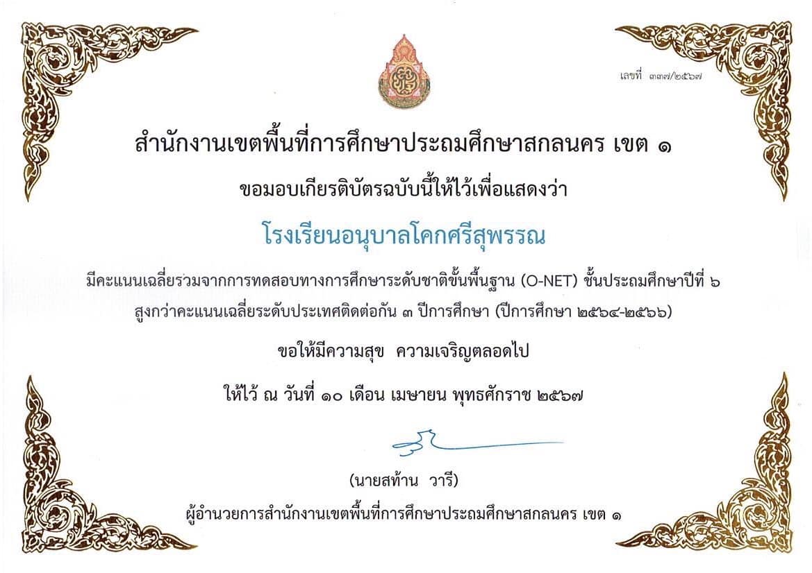 โรงเรียนอนุบาลโคกศรีสุพรรณ ได้รับเกียรติบัตรจากสำนักงานเขตพื้นที่การศึกษาประถมศึกษาสกลนคร เขต 1เพื่อแสดงว่า โรงเรียนอนุบาลโคกศรีสุพรรณ มีคะแนนเฉลี่ยรวมในการทดสอบทางการศึกษาระดับชาติขั้นพื้นฐาน (O-NET) ชั้นประถมศึกษาปีที่ 6 สูงกว่าคะแนนเฉลี่ยระดับประเทศ ติดต่อกัน 3 ปีการศึกษา (ปีการศึกษา 2564-2566)