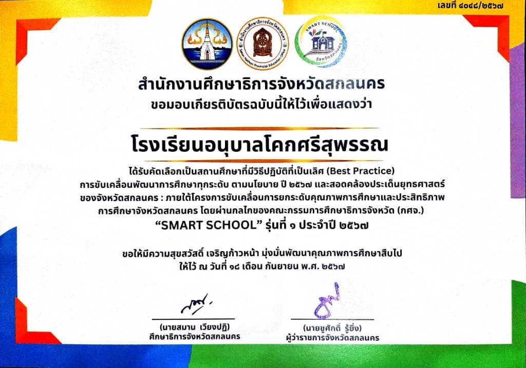โรงเรียนอนุบาลโคกศรีสุพรรณ ได้รับคัดเลือกเป็นสถานศึกษาที่มีวิธีปฏิบัติที่เป็นเลิศ (Best Practice) การขับเคลื่อนพัฒนาการศึกษาทุกระดับ ตามนโยบาย ปี 2567 และสอดคล้องประเด็นยุทธศาสตร์ของจังหวัดสกลนคร ภายใต้โครงการขับเคลื่อนการยกระดับคุณภาพการศึกษาและประสิทธิภาพ การศึกษาจังหวัดสกลนคร โดยผ่านกลไกของคณะกรรมการศึกษาธิการจังหวัด (กศจ.) SMART SCHOOL รุ่นที่ 1 ประจำปี 2567 ให้ไว้ ณ วันที่ 18 กันยายน 2567